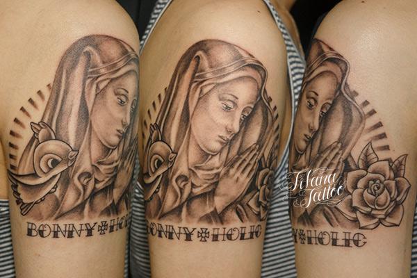 マリア様|バラ|燕|文字のタトゥー タトゥー 一覧 > Tattoo by Kaz 2015.01.23 マリア様のモチーフにバラ|薔薇、ツバメ|燕、文字をデザインしたタトゥー|刺青作品です。所要時間の目安は3時間前後、1回で完成するサイズです。 Style メンズ チカーノ・ブラック&グレイ 洋柄 Motif 世界の神様 Tattoo Tag 聖母マリア Size CDジャケット Body parts 肩