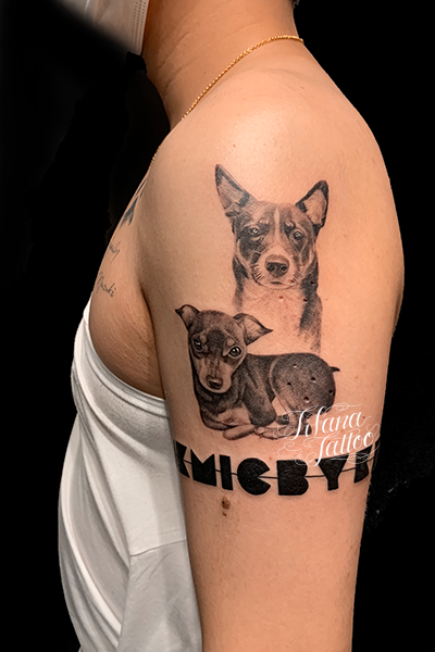 犬のポートレートタトゥー タトゥー 一覧 > Tattoo by AKI 2021.07.14 2匹の犬の写真の文字|レタリングを組み合わせたポートレートタトゥー。所要時間の目安は5時間前後です。 Style メンズ チカーノ・ブラック&グレイ 洋柄 Motif 動物 Tattoo Tag 犬 Size CDジャケット Body parts 腕