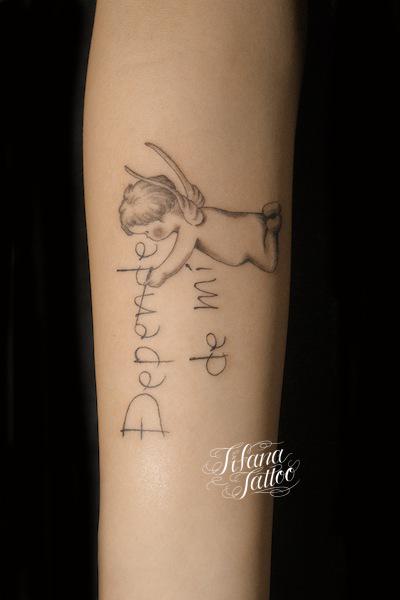 天使の落書き風タトゥー タトゥー 一覧 > Tattoo by Mica 2019.11.03 ゆるい感じの天使、落書き風のレタリングをひとつのデザインにまとめたタトゥー。所要時間の目安は1時間前後です。 Style メンズ ガールズ レタリング 洋柄 Motif 天使・悪魔 Size タバコサイズ Body parts 腕