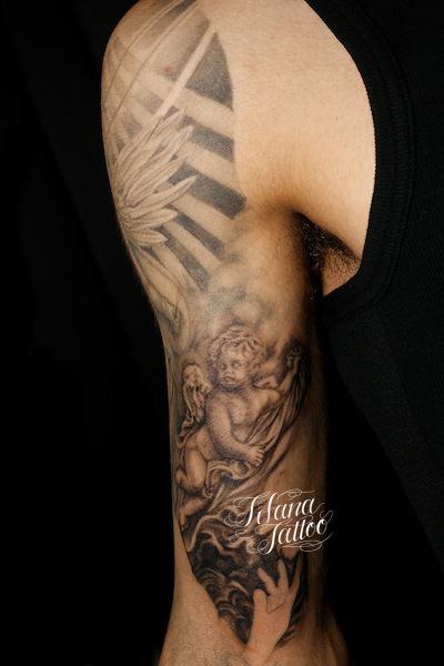 天使のタトゥー|製作中 タトゥー 一覧 > Tattoo by Kaz 2015.04.27 製作進行中の天使をモチーフにしたタトゥー|刺青作品です。 Style メンズ チカーノ・ブラック&グレイ 洋柄 Motif 天使・悪魔 Size 7分~フルスリーブ Body parts 腕