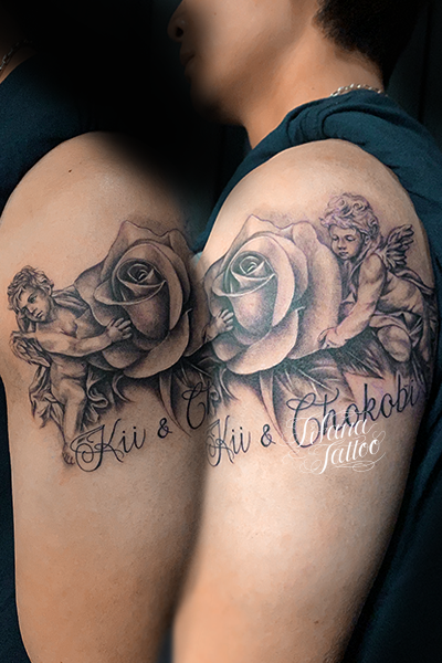 天使|薔薇|文字のタトゥー タトゥー 一覧 > Tattoo by Naoto 2021.08.23 薔薇を抱えた天使、文字|レタリングを組み合わせてデザインしたチカーノ・タトゥー。所要時間の目安は5時間半前後です。 Style メンズ チカーノ・ブラック&グレイ 洋柄 Motif 天使・悪魔 Tattoo Tag 薔薇、ローズ Size CDジャケット Body parts 肩