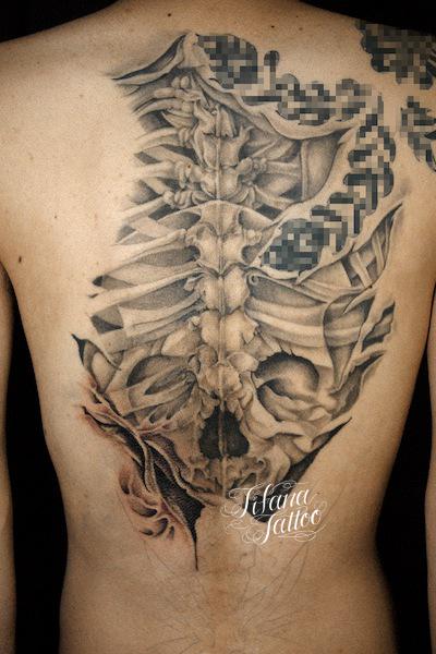 背骨|スカルのタトゥー タトゥー 一覧 > Tattoo by Kaz 2015.02.13 リアルな背骨とスカルをデザインした製作中のタトゥー|刺青作品です。 Style メンズ チカーノ・ブラック&グレイ 洋柄 Motif スカル Size 背中一面 Body parts 背中