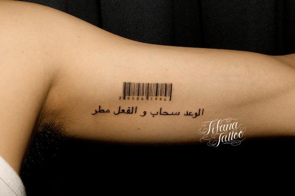 バーコード|アラビア文字のタトゥー タトゥー 一覧 > Tattoo by Naoto 2015.09.21 二の腕の内側の部位にバーコードとアラビア文字のデザインを彫ったタトゥー|刺青作品です。所要時間の目安は1時間半前後です。 Style メンズ レタリング 洋柄 Motif 文字・数字 Size タバコサイズ Body parts 腕