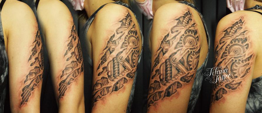 バイオメカ・タトゥー タトゥー 一覧 > Tattoo by Mica 2015.01.12 破れた皮膚からバイオメカが現れたデザインのタトゥー|刺青作品です。所要時間の目安は5時間前後、1回の施術で完成するサイズです。 Style ガールズ チカーノ・ブラック&グレイ 洋柄 Size ハーフスリーブ Body parts 肩 腕