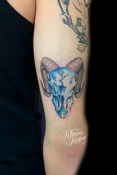 青色のバッファロースカル タトゥー 一覧 > Tattoo by Kaz 2019.12.08 バッファロースカルのモチーフを青色にデザインしたタトゥー。所要時間の目安は2時間前後です。 Style メンズ 洋柄 Motif スカル 動物 Size タバコサイズ Body parts 腕