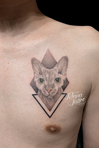 スフィンクスのポートレートタトゥー タトゥー 一覧 > Tattoo by AKI 2023.06.18 スフィンクス|猫の写真をベースに幾何学模様を組み合わせたファインライン・タトゥー。完成までの来店回数の目安は2回です。 Style ファインライン メンズ 洋柄 Motif 動物 ポートレイト Tattoo Tag 幾何学模様 猫 Size iphoneサイズ Body parts 胸