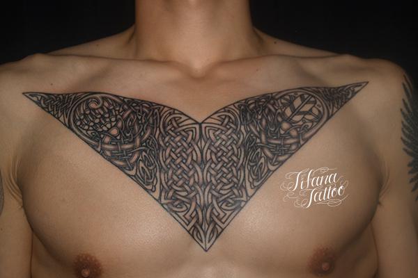 ケルティック・タトゥー タトゥー 一覧 > Tattoo by Mica 2015.01.07 シンメトリーな構図でデザインされたケルティック柄のトライバルタトゥーです。所要時間の目安は8時間前後、2回の施術で完成させる事が可能なサイズです。 Style メンズ トライバル Motif シンメトリー Body parts 胸