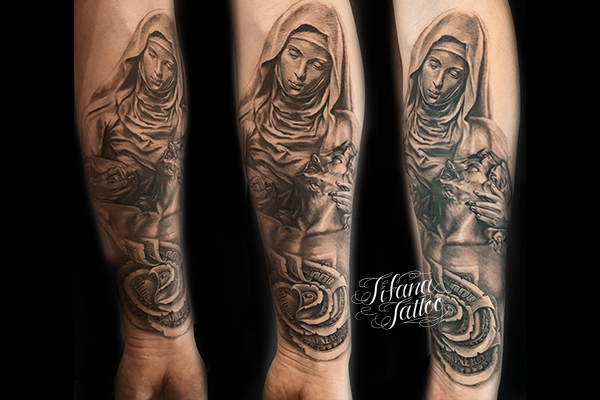 ピエタ|マネーローズのチカーノ・タトゥー タトゥー 一覧 > Tattoo by Naoto 2022.01.19 聖母マリアがキリスト|ジーザスを抱きかかえる名作ピエタをベースに、マネーローズを組み合わせたチカーノ・タトゥー。完成までの来店回数の目安は3回前後です。 Style メンズ チカーノ・ブラック&グレイ 洋柄 Motif 世界の神様 ラッキーアイテム Tattoo Tag マネーローズ Size B5サイズ以上 Body parts 腕
