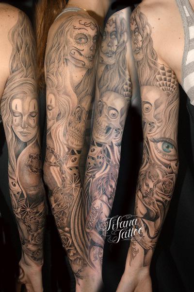 チカーノ・タトゥー タトゥー 一覧 > Tattoo by Mica 2015.09.28 クラウンガール|Day of the dead、スカル、目、ダイス、女性、バラ、鎖、蜘蛛の巣など様々なモチーフを腕全体にデザインしたフルスリーブのチカーノ・タトゥーです。 Style ガールズ チカーノ・ブラック&グレイ 洋柄 Motif スカル 女神 人体パーツ Tattoo Tag ダイス、賽子 目 薔薇、ローズ Size 7分~フルスリーブ Body parts 腕