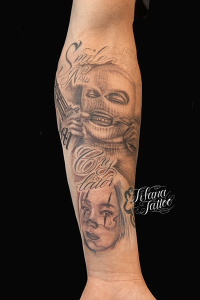 覆面マスクとクラウンガールのチカーノ・タトゥー タトゥー 一覧 > Tattoo by Kaz 2022.10.12 覆面マスク、クラウンガール、レタリングをひとつのデザインにまとめたチカーノ・タトゥー。完成までの来店回数の目安は2回から3回です。 Style メンズ チカーノ・ブラック&グレイ 洋柄 Tattoo Tag クラウンガール Size B5サイズ以上 Body parts 腕