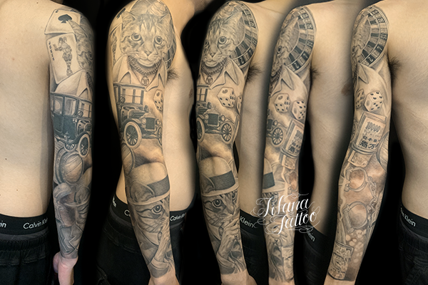愛猫のチカーノ・タトゥー タトゥー 一覧 > Tattoo by Mica 2023.04.18 チカーノ・スタイルにデザインした愛猫にクラシックカー、ダイス、ルーレット、1万円の札束を組み合わせたチカーノ・タトゥー。完成までの来店回数の目安は10回前後です。 Style メンズ チカーノ・ブラック&グレイ Motif 動物 ラッキーアイテム Tattoo Tag ダイス、賽子 ルーレット 猫 Size 7分~フルスリーブ Body parts 腕