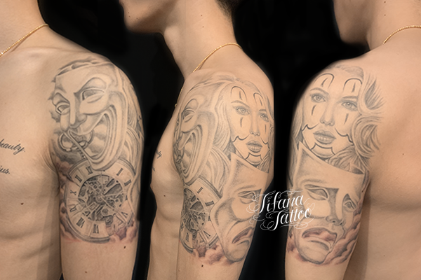 TWO FACE|クラウンガール|懐中時計のチカーノ・タトゥー タトゥー 一覧 > Tattoo by Mica 2023.10.09 ツーフェイス、クランガール、懐中時計をひとつのデザインにまとめたチカーノ・タトゥー。完成までの来店回数の目安は4回前後です。 Style メンズ チカーノ・ブラック&グレイ 洋柄 Motif アクセサリー Tattoo Tag クラウンガール ツーフェイス 時計 Size ハーフスリーブ Body parts 腕
