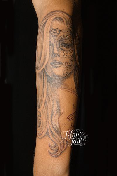 チカーノタトゥー|製作中 タトゥー 一覧 > Tattoo by Mica 2015.12.26 クラウンガールがモチーフの製作中|チカーノタトゥーです。 Style メンズ チカーノ・ブラック&グレイ 洋柄 Motif ポートレイト Size B5サイズ以上 Body parts 腕