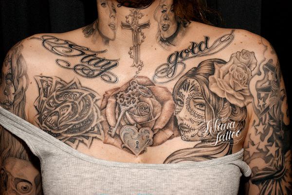 チカーノ・タトゥー タトゥー 一覧 > Tattoo by Mica 2016.12.10 クラウンガール、マネーローズ、バラ、鍵、レタリング、、クロスのモチーフをひとつのデザインにまとめたチカーノ・タトゥーです。 Style ガールズ チカーノ・ブラック&グレイ 洋柄 Motif クロス アクセサリー 文字・数字 植物 ポートレイト Tattoo Tag 薔薇、ローズ 鍵 Size B5サイズ以上 Body parts 首 胸