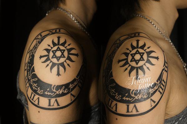 時計|月|太陽|六芒星|文字のタトゥー タトゥー 一覧 > Tattoo by Mica 2019.05.06 時計、月、太陽、六芒星、文字をひとつのデザインにまとめた肩の部位のタトゥー|刺青作品です。所要時間の目安は5時間前後です。 Style メンズ トライバル 洋柄 Motif アクセサリー 文字・数字 宇宙 ラッキーアイテム Tattoo Tag 太陽 星 時計 月 Size B5サイズ以上 Body parts 肩