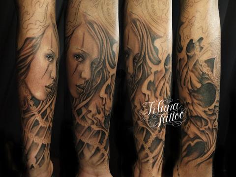 クラウンガールのチカーノ・タトゥー タトゥー 一覧 > Tattoo by Kaz 2015.01.12 クラウンガールとスカルのモチーフをデザインしたチカーノ・タトゥーです。所要時間の目安は12時間前後、3回から4回の施術で完成するサイズです。 Style メンズ チカーノ・ブラック&グレイ 洋柄 Motif スカル Size B5サイズ以上 Body parts 腕