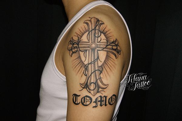 クロスと蔦のタトゥー タトゥー 一覧 > Tattoo by Mica 2015.01.02 クロスにトライバル調の蔦、文字をデザインしたタトゥー|刺青作品画像です。完成までの所要時間の目安は4時間半前後、1日で完成するサイズです。 Style メンズ チカーノ・ブラック&グレイ 洋柄 Motif クロス Size B5サイズ以上 Body parts 肩 腕