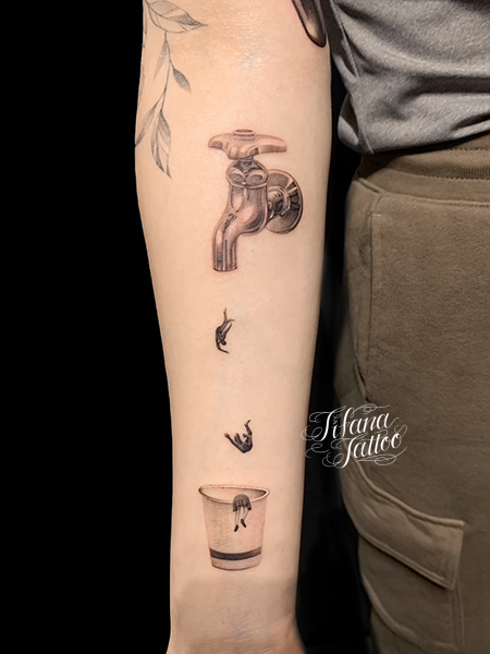 蛇口|人間|コップのファインライン・タトゥー タトゥー 一覧 > Tattoo by AKI 2024.11.01 蛇口から飛び出た人間、コップに引っかかった人間、ひとつのタトゥーからストーリーが湧き出てくるファインライン・タトゥー。所要時間の目安は6時間前後です。 Style ファインライン メンズ 洋柄 Size CDジャケット Body parts 腕