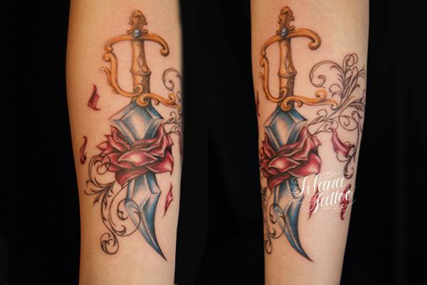 ダガー|薔薇のタトゥー タトゥー 一覧 > Tattoo by Naoto 2015.01.18 薔薇に刺さったダガー|短剣のモチーフを女性向けにデザインしたタトゥー|刺青作品です。所要時間の目安は5時間前後、1回で完成するサイズです。 Style ガールズ 洋柄 Motif 植物 武器 Tattoo Tag ダガー、短剣 薔薇、ローズ Size CDジャケット Body parts 腕