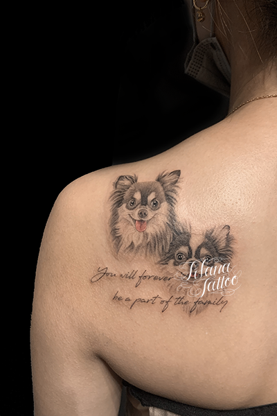愛犬と文字のタトゥー タトゥー 一覧 > Tattoo by AKI 2023.10.29 愛犬2匹とメッセージ|文字を組み合わせたポートレート・タトゥー。完成までの来店回数の目安は2回です。 Style ファインライン ガールズ 洋柄 Motif 動物 ポートレイト Tattoo Tag 犬 Size CDジャケット Body parts 肩