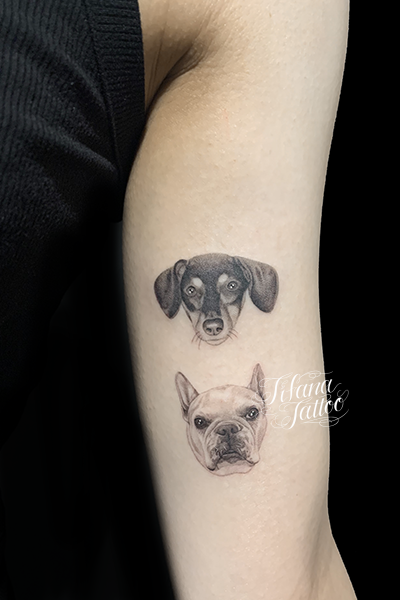 愛犬のポートレートタトゥー タトゥー 一覧 > Tattoo by AKI 2023.11.03 愛犬2匹の顔の写真を繊細な技術でリアルに表現したポートレート・タトゥー。完成までの施術回数の目安は2回です。 Style ファインライン メンズ 洋柄 Motif 動物 ポートレイト Size iphoneサイズ Body parts 腕