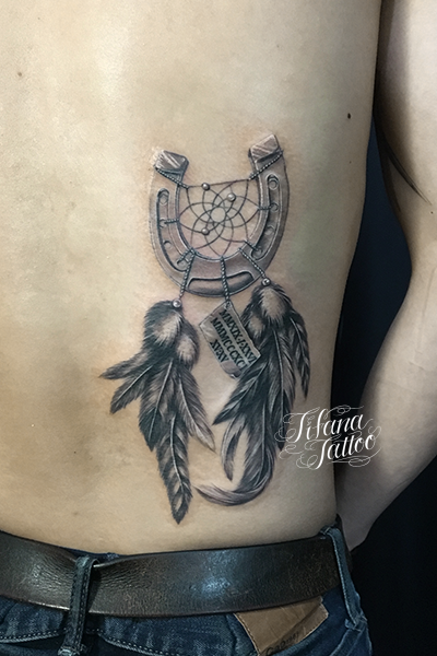ドリームキャッチャーのタトゥー タトゥー 一覧 > Tattoo by Naoto 2020.08.12 蹄鉄にフェザー|羽を組み合わせたドリームキャッチャーのモチーフをデザインしたファインラインタトゥー。 所要時間の目安は8時間前後です。 Style ファインライン メンズ ガールズ チカーノ・ブラック&グレイ 洋柄 Motif ラッキーアイテム Tattoo Tag ドリームキャッチャー Size B5サイズ以上 Body parts 腰