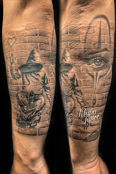 クラウンメイクの目|バンクシーの壁画のタトゥー タトゥー 一覧 > Tattoo by Naoto 2022.11.29 バンクシーの壁画にクラウンメイクの目を組み合わせたファインライン・タトゥー。完成までの来店回数の目安は2回です。 Style ファインライン メンズ チカーノ・ブラック&グレイ 洋柄 Motif ハート 人体パーツ Tattoo Tag 目 Size B5サイズ以上 Body parts 腕