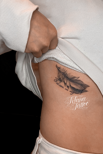 羽|フェザーのファインライン・タトゥー タトゥー 一覧 > Tattoo by LEI 2023.02.07 レタリングと羽|フェザーのモチーフを繊細な技法で表現したファインライン・タトゥー。所要時間の目安は3時間前後です。 Style ファインライン ガールズ 洋柄 Motif 文字・数字 羽・翼 Size iphoneサイズ Body parts 脇