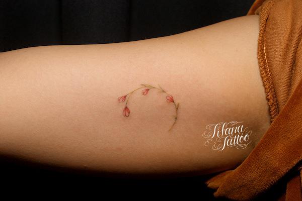 Fine Line Tattoo タトゥー 一覧 > Tattoo by AKI 2017.10.24 花のモチーフを繊細なデザインに仕上げた腕の内側部位のワンポイントタトゥーです。所要時間の目安は1時間前後です。 Style ガールズ 洋柄 Motif 植物 Size ワンポイント Body parts 腕