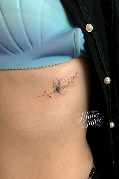 花のファインラインタトゥー タトゥー 一覧 > Tattoo by AKI 2020.06.27 細い線|ファインラインで植物を女性向けにデザインしたガールズタトゥーです。所要時間の目安は1時間半前後です。 Style ファインライン ガールズ 洋柄 Motif 植物 Size タバコサイズ Body parts 脇