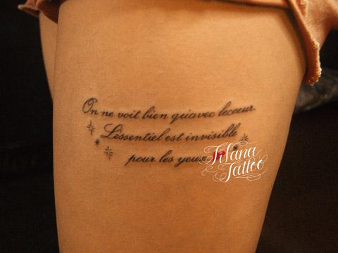 French Script Tattoo タトゥー 一覧 > Tattoo by Kaz 2015.01.10 フランス語の文章を筆記体の書体で女性向けにデザインしたレタリングタトゥーです。完成までの所要時間の目安は1時間前後です。 Style ガールズ レタリング Motif 文字・数字 Tattoo Tag フランス語 Size タバコサイズ Body parts 脚