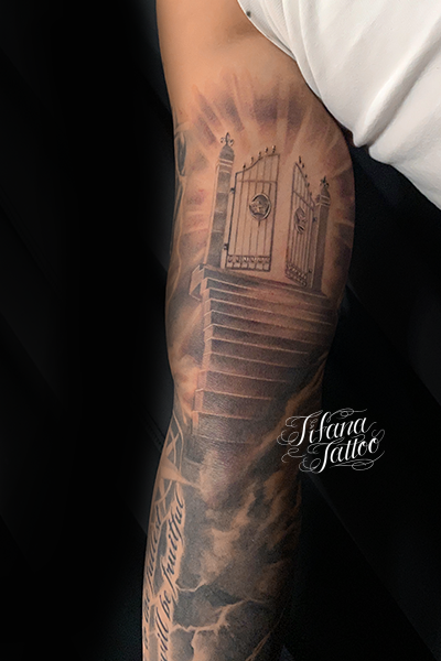 階段と門のタトゥー タトゥー 一覧 > Tattoo by Naoto 2021.08.24 フルスリーブの上腕内側のスペースを有効活用した階段と門のチカーノ・タトゥー。 Style メンズ チカーノ・ブラック&グレイ 洋柄 Body parts 腕