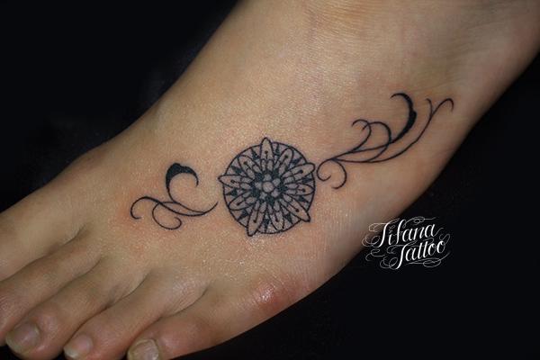 花の幾何学模様のガールズタトゥー タトゥー 一覧 > Tattoo by Mica 2015.01.07 花柄の幾何学模様を円形にデザインしたガールズタトゥーです。完成までの所要時間の目安は1時間前後です。 Style ガールズ 洋柄 Motif ヘナ・ペイズリー柄 図形 Tattoo Tag 幾何学模様 Size タバコサイズ Body parts 足