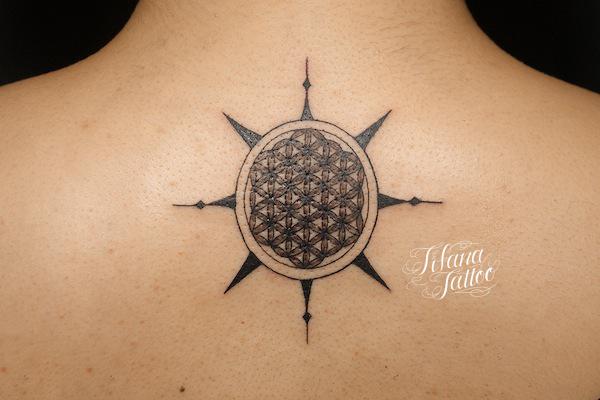 幾何学模様|太陽タトゥー タトゥー 一覧 > Tattoo by Mica 2016.04.18 太陽の中に幾何学模様をデザインした首下の部位のタトゥー|刺青作品です。所要時間の目安は2時間前後、1回で完成するサイズです。 Style メンズ 洋柄 Motif 宇宙 図形 Tattoo Tag 太陽 幾何学模様 Size iphoneサイズ Body parts 首