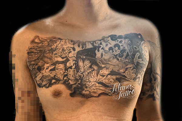 百鬼夜行のタトゥー タトゥー 一覧 > Tattoo by Kaz 2023.09.28 百鬼夜行の持ち込みデザインのタトゥー。完成までの来店回数の目安は6回前後です。 Style メンズ チカーノ・ブラック&グレイ 和柄 Motif ファンタジー Size B5サイズ以上 Body parts 胸