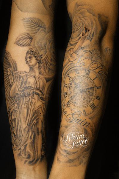 女神|懐中時計|薔薇のタトゥー タトゥー 一覧 > Tattoo by Mica 2019.03.05 女神、懐中時計、薔薇のモチーフをひとつのデザインにまとめたチカーノ・タトゥーです。所要時間の目安は15時間前後です。 Style メンズ チカーノ・ブラック&グレイ Motif アクセサリー 女神 植物 Tattoo Tag 時計 薔薇、ローズ Size B5サイズ以上 Body parts 腕