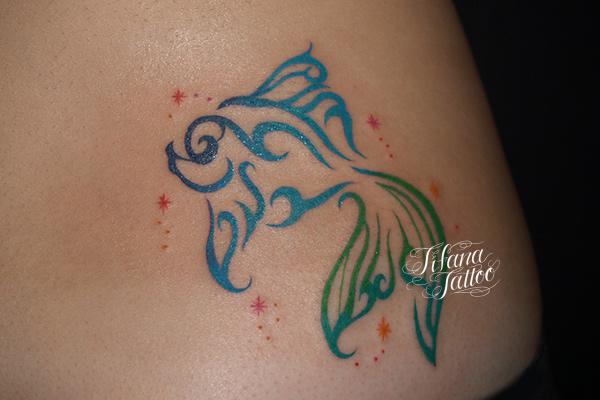 カラー・トライバル・タトゥー タトゥー 一覧 > Tattoo by Mica 2015.01.02 腰の部位に金魚のモチーフをトライバルにデザインしたガールズタトゥーです。完成までの所要時間の目安は2時間半前後です。 Style ガールズ トライバル Motif 水の生き物 Tattoo Tag 金魚 Size iphoneサイズ Body parts 腰