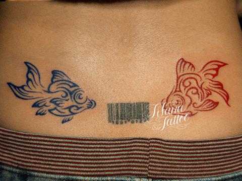 青|赤の金魚のタトゥー タトゥー 一覧 > Tattoo by Mica 2015.01.12 腰の部位に青、赤で2匹の金魚のモチーフをトライバルにデザインしたシンメトリーなタトゥー|刺青作品です。所要時間の目安は3時間半前後、1回で完成するサイズです。 Style ガールズ トライバル Motif 水の生き物 シンメトリー Tattoo Tag 金魚 Size CDジャケット Body parts 腰