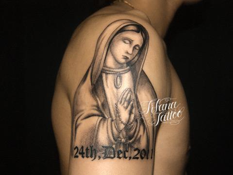 Guadalupe Tattoo タトゥー 一覧 > Tattoo by Mica 2015.01.08 グアダルーペ|マリア様のモチーフと日付をデザインしたタトゥー|刺青作品です。所要時間の目安は3時間前後、1回の施術で完成するサイズです。 Style メンズ チカーノ・ブラック&グレイ 洋柄 Motif 世界の神様 Tattoo Tag 聖母マリア Size CDジャケット Body parts 肩