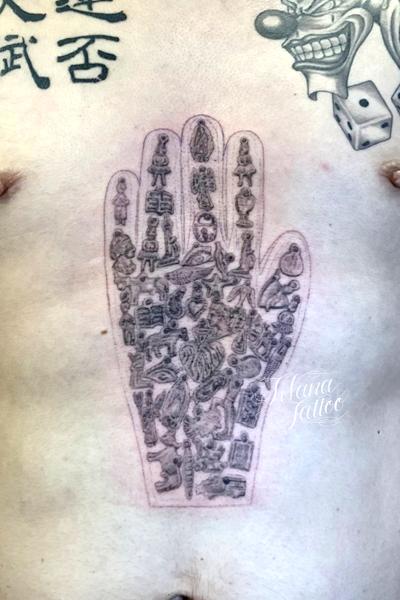 ハムサ調の持ち込みデザインタトゥー タトゥー 一覧 > Tattoo by Mica 2020.10.14 持ち込みデザインのハムサ調のタトゥー。所要時間の目安は6時間半前後です。 Style メンズ 洋柄 Motif 人体パーツ Size CDジャケット Body parts 胸