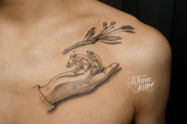 手と草のタトゥー タトゥー 一覧 > Tattoo by Mica 2016.03.29 手と植物をデザインした胸の部位のタトゥーです。所要時間の目安は2時間半前後です。 Style メンズ 洋柄 Motif 植物 人体パーツ Size CDジャケット Body parts 胸