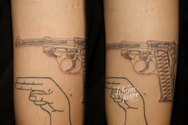 手銃と拳銃のタトゥー タトゥー 一覧 > Tattoo by AKI 2021.12.07 手銃と拳銃を組み合わせたタトゥー。 Style メンズ 洋柄 Motif 武器 Size iphoneサイズ Body parts 腕