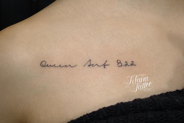 手書き風の書体のタトゥー タトゥー 一覧 > Tattoo by Mica 2015.01.15 手書き風の書体で文字をデザインしたレタリングタトゥーです。完成までの所要時間の目安は15分前後です。 Style ガールズ レタリング Motif 文字・数字 Size ワンポイント Body parts 胸