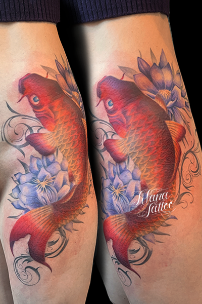 鯉と睡蓮のタトゥー タトゥー 一覧 > Tattoo by Kaz 2023.04.23 フルカラーで鯉、睡蓮のモチーフをデザインしたタトゥー。完成までの来店回数の目安は8回前後です。 Style ガールズ 和柄 Motif 水の生き物 Tattoo Tag 蓮、ロータス 鯉 Size B5サイズ以上 Body parts 脚