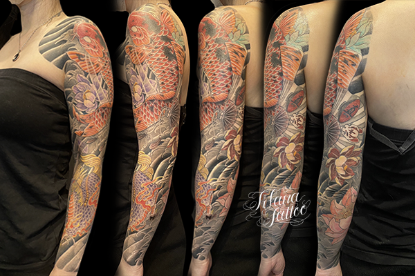 鯉|麒麟|蓮のタトゥー タトゥー 一覧 > Tattoo by Yosh 2023.04.25 鯉、麒麟、蓮のモチーフをひとつのデザインにまとめたフルスリーブ・タトゥー。完成までの来店回数の目安は10回前後です。 Style ガールズ 和柄 Motif 水の生き物 植物 Tattoo Tag 蓮、ロータス 鯉 麒麟 Size 7分~フルスリーブ Body parts 腕