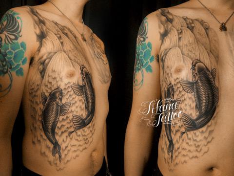 鯉の滝登りの刺青作品 タトゥー 一覧 > Tattoo by Mica 2015.01.09 鯉の滝登り|登竜門のモチーフをデザインしたタトゥー|刺青作品です。所要時間の目安は20時間前後、4回から5回の施術で完成するサイズです。 Style メンズ 和柄 Motif 水の生き物 Tattoo Tag 鯉 Size B5サイズ以上 Body parts 胸 腹
