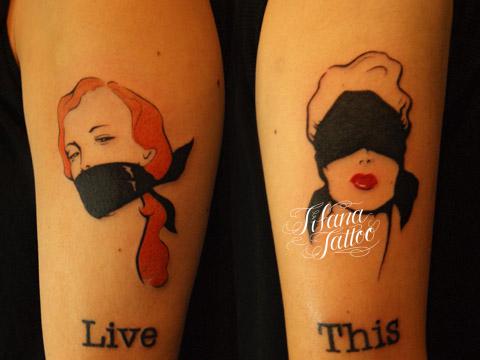 持込デザインのタトゥー タトゥー 一覧 > Tattoo by Naoto 2015.01.12 マスクをした女性と目隠しをした女性のモチーフに文字を彫ったタトゥー|刺青作品です。所要時間の目安は3時間前後、1回で完成するサイズです。 Style メンズ ガールズ 洋柄 Motif シンメトリー Size iphoneサイズ Body parts 腕