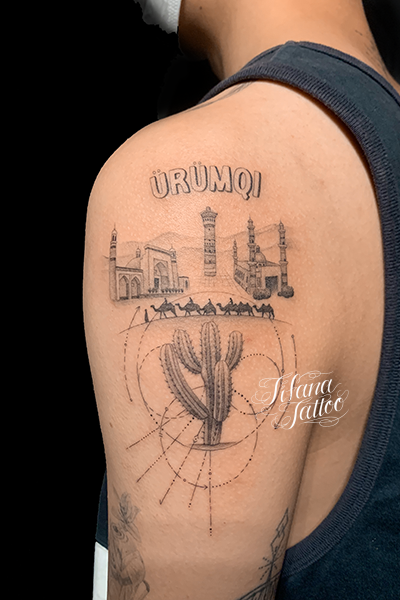 ウルムチのランドスケープ・タトゥー タトゥー 一覧 > Tattoo by AKI 2023.06.12 ウルムチの街並み|幾何学模様をファインラインで表現したランドスケープ・タトゥー。 Style ファインライン メンズ 洋柄 Motif 図形 Tattoo Tag 幾何学模様 風景 Size B5サイズ以上 Body parts 腕