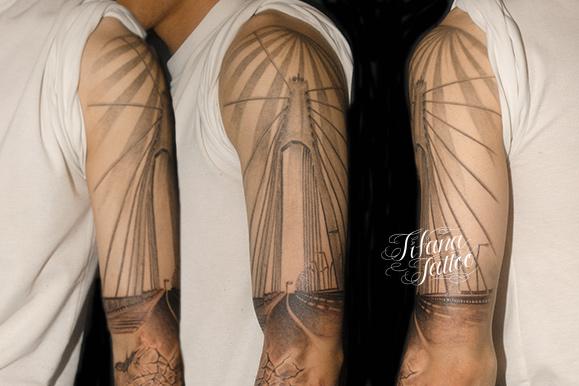LANDSCAPE TATTOO タトゥー 一覧 > Tattoo by Mica 2015.01.23 大師橋のモチーフをハーフスリーブ用にデザインした街の風景のタトゥー|刺青作品です。所要時間の目安は7時間前後、2回で完成するサイズです。 Style メンズ チカーノ・ブラック&グレイ 洋柄 Tattoo Tag 風景 Size ハーフスリーブ Body parts 腕