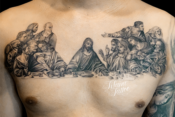 最後の晩餐のファインライン・タトゥー タトゥー 一覧 > Tattoo by Naoto 2022.11.22 胸全体を使った最後の晩餐のファインライン・タトゥー。完成までの来店回数の目安は6回前後です。 Style ファインライン メンズ チカーノ・ブラック&グレイ 洋柄 Motif 世界の神様 Tattoo Tag キリスト、ジーザス Size B5サイズ以上 Body parts 胸